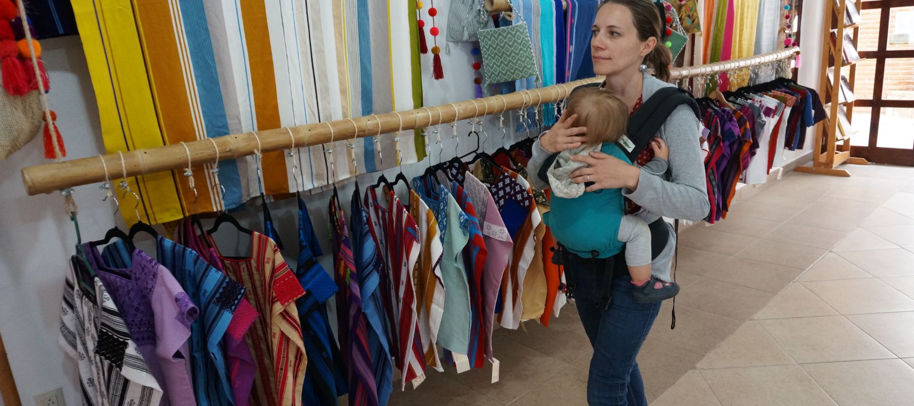 Decidimos brindarles a estas increíbles mujeres una plataforma para vender sus telas a nivel internacional. De esta idea surgió un producto que sirve de plataforma: el portabebés NIRMI.
